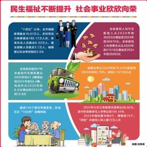 “十四五”以來(lái),全市城鎮(zhèn)新增就業(yè)16.61萬(wàn)人,農(nóng)村勞動(dòng)力轉(zhuǎn)移就業(yè)185.17萬(wàn)人次,各類失業(yè)人員就業(yè)9.32萬(wàn)人,就業(yè)困難人員就業(yè)3.7萬(wàn)人,城鎮(zhèn)登記失業(yè)率控制在2.5%。就業(yè)穩(wěn)定有效促進(jìn)了居民收入增長(zhǎng),全體居民人均可支配收入從2020年的30203元增加至2024年的36970元。全體居民人均消費(fèi)支出從2020年的21018元增加至2024年的25003元。城鄉(xiāng)居民生活品質(zhì)不斷提升,耐用消費(fèi)品升級(jí)換代,全體居民每百戶年末家用汽車(chē)擁有量從2020年的47.2輛增加到2024年的59.4輛,電動(dòng)車(chē)從2020年的6.6臺(tái)增加到2024年的13.8臺(tái)。
