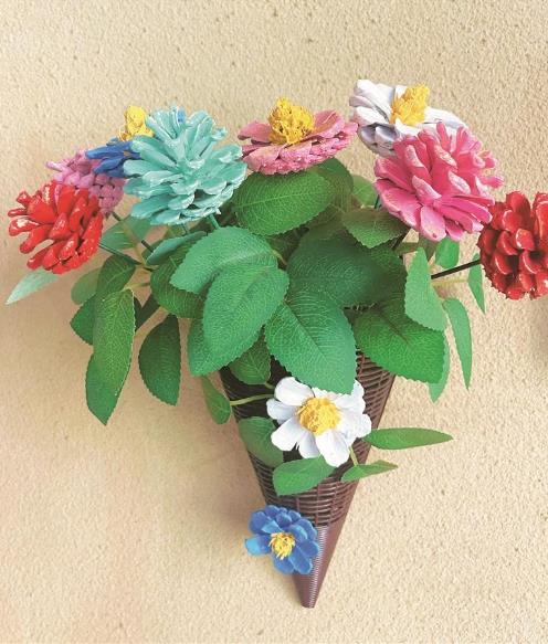 心動(dòng),便即刻行動(dòng)。達(dá)藏措介紹,從松果采集到成品誕生,需經(jīng)過多道細(xì)致工序。首先要對收集的松果進(jìn)行初步篩選,剔除破損嚴(yán)重、遭蟲蛀的不合格材料。接著清洗松果,去除表面灰塵與雜質(zhì),自然晾曬3天至5天。干燥完成后,依據(jù)松花的形態(tài)、大小進(jìn)行創(chuàng)意構(gòu)思與設(shè)計(jì),并開始涂色、拼接、組裝等加工環(huán)節(jié),最后是細(xì)節(jié)修飾與整體處理,一件完整的松果藝術(shù)品才算制作完成。