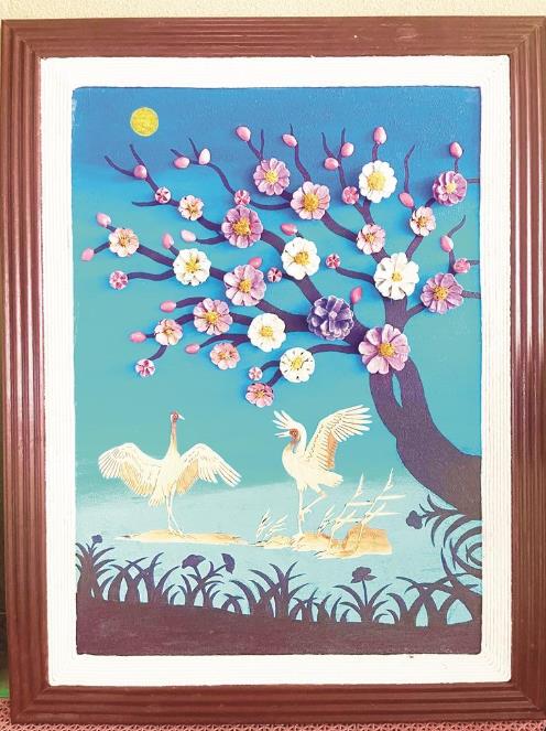 今年8月,達(dá)藏措用松果、果核,還有青稞秸稈,制作出作品《松秸韻里鶴花月夜》。這件作品高80厘米、寬60厘米,耗時(shí)一周完成。畫作里有盛開的花和月夜等元素。青稞秸稈在達(dá)藏措的巧手下,經(jīng)過剪、拼、貼等細(xì)致工序,化作展翅的白鶴造型。松果經(jīng)染色塑形,化作繁茂的花樹。“這樣的組合,既保留了松果的天然肌理質(zhì)感,又融入了青稞秸稈承載的高原農(nóng)耕文化元素,讓作品充滿青海本土的獨(dú)特韻味。”達(dá)藏措解釋道。