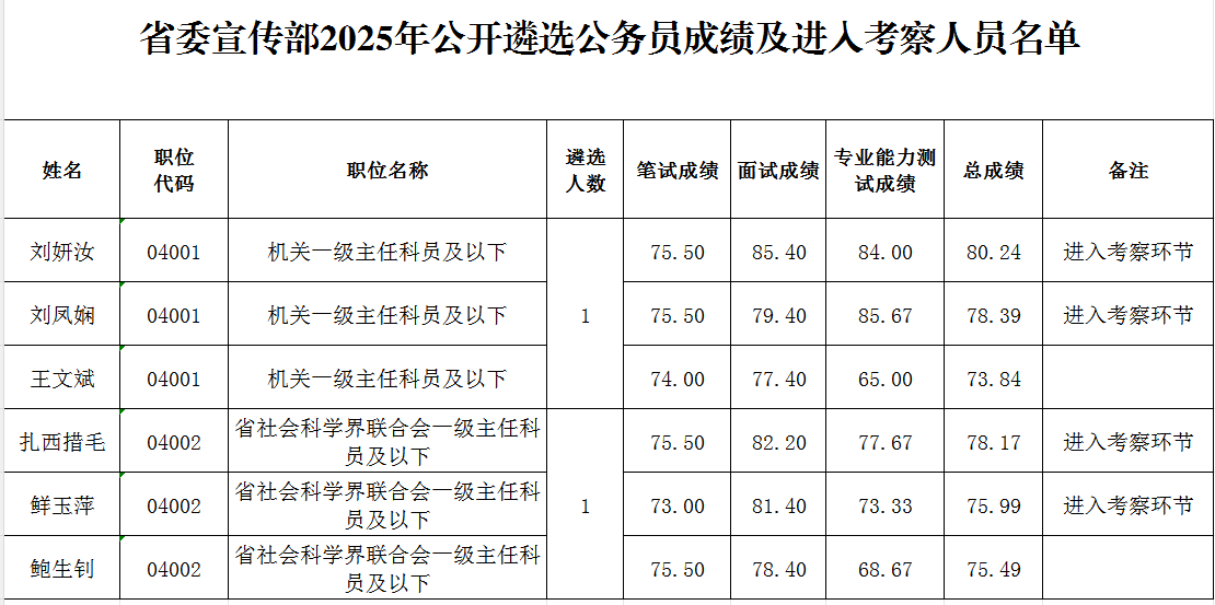 附件:省委宣傳部2025年公開遴選公務(wù)員成績(jī)及進(jìn)入考察人員名單