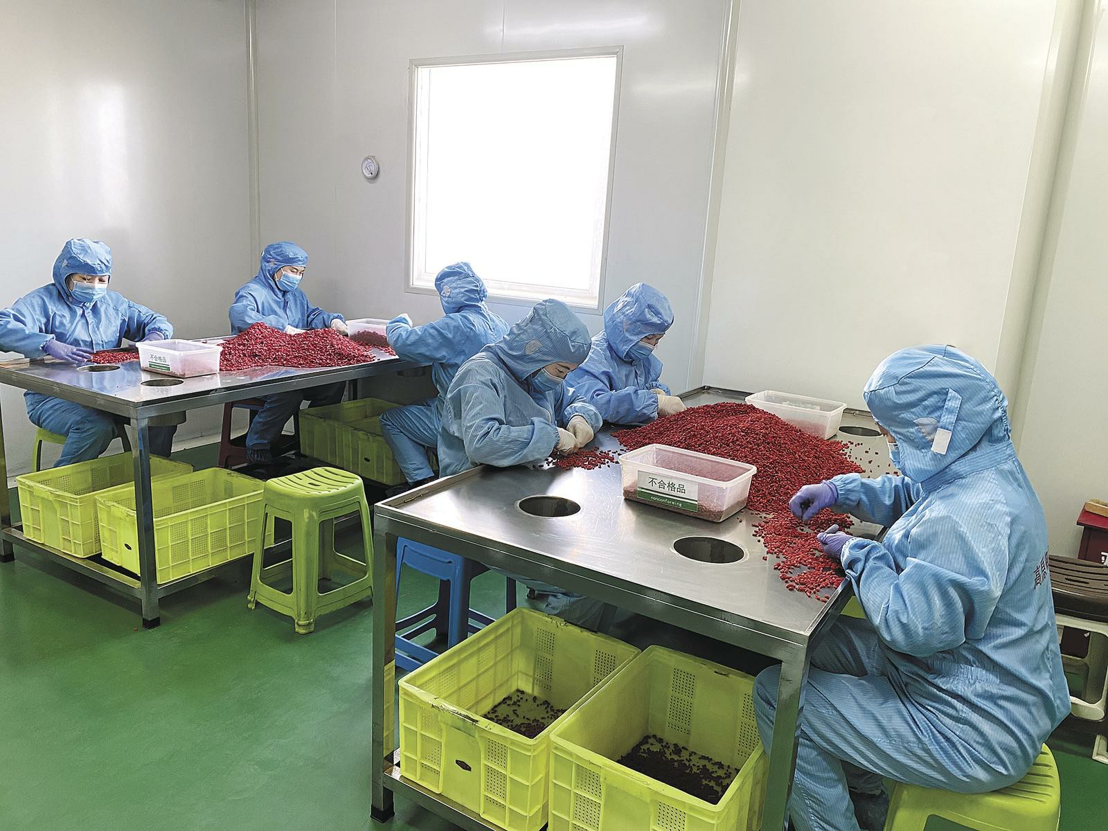 工人正在挑揀枸杞。