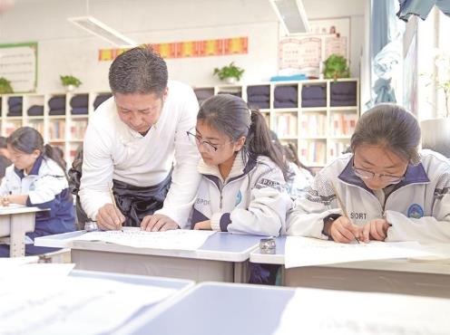 藏文書法興趣班里,老師指導(dǎo)學(xué)生練習(xí)書法。祁曉軍 攝