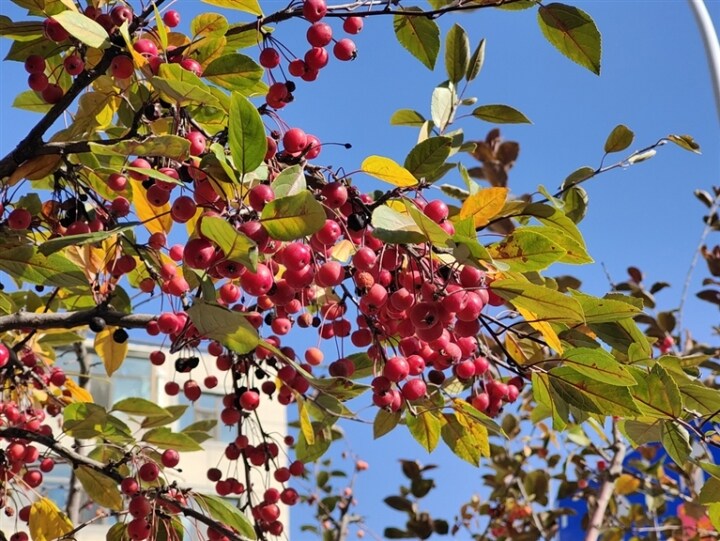 這幾天,西寧市各大公園、街道、廣場等地的海棠、山楂等景觀植物經過一春一夏的孕育,果實正盛,顆顆飽滿的果實在樹葉映襯下紅艷欲滴。10月22日,秋日暖陽傾灑,記者來到城北區(qū)朝陽公園,公園內,老人們在長椅上悠閑地曬太陽,孩子們在樹下嬉戲玩耍,不少市民結伴而行,時不時駐足欣賞身邊的美景。穿行于一草一木之間,目之所及是黃、橙、紅、綠疊加的多彩景色,就仿佛步入了“莫奈的花園”油畫中的場景。色彩斑斕的樹葉掩映著亭臺樓閣,秋日美景在藍天白云的映襯下宛若一幅畫卷。一串串或紅或橙的海棠果實綴滿枝頭與樹葉相映成趣,宛如糖葫蘆般可愛,陽光透過葉片縫隙灑在海棠果上,團團簇簇嘟嘟嚕嚕的果子像一片火紅的云霞落在樹梢更顯鮮艷奪目。“今年的果子感覺更紅更飽滿,讓人感覺到春華秋實的喜悅。”市民劉女士忍不住拿出手機拍照定格這美好的景色。