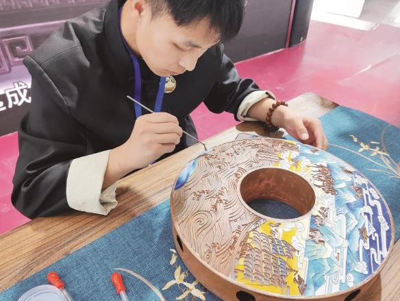 為了讓參觀者直觀感受景泰藍(lán)制作過程,張仕賢在銅質(zhì)的胎型前俯身創(chuàng)作起來。“點藍(lán)”是賦予景泰藍(lán)絢麗色彩的關(guān)鍵步驟,張仕賢通過吸管控制釉彩流速,在銅絲間隙中模擬出國畫暈染效果。參觀者中有人舉起手機(jī)拍攝細(xì)節(jié),感嘆道:“這真是需要技術(shù)和耐心。”