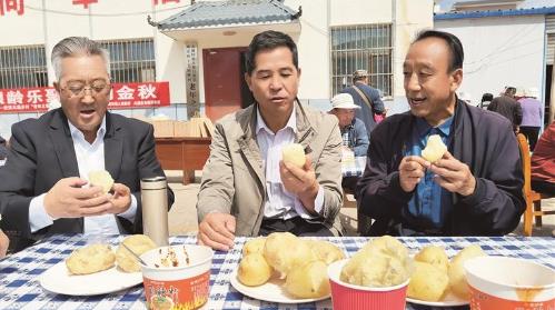 11時許,城關(guān)鎮(zhèn)下毛佰勝村“老年之家”院落里格外熱鬧。老人們分工協(xié)作,有的忙著焪洋芋,有的忙著拌涼菜,還有的熟練地揪著面片,大家忙得不亦樂乎。