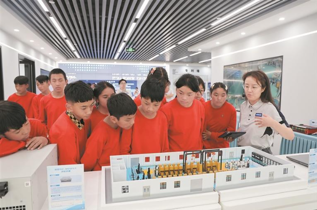 9月28日,瑪多縣學(xué)生在國(guó)網(wǎng)北京電科院國(guó)網(wǎng)級(jí)實(shí)驗(yàn)室參觀通州牛堡屯充電設(shè)施自動(dòng)檢驗(yàn)檢測(cè)流水線模型。國(guó)網(wǎng)果洛供電公司供圖