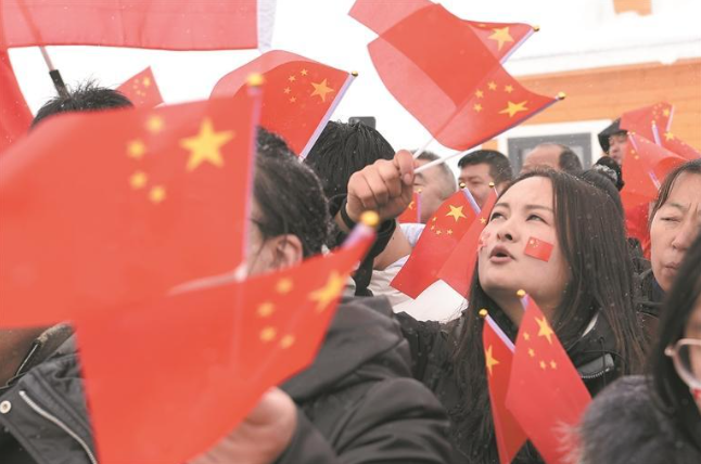 10月1日10時01分,國歌在海拔3800米的拉脊山奏響,鮮艷的五星紅旗迎著風(fēng)雪緩緩升起,歌聲在群山間環(huán)繞。由三江源生態(tài)保護(hù)基金會發(fā)起的此次“日出云海映國旗·守護(hù)江源慶華誕”國慶主題公益活動,吸引了近百人參加;顒蝇F(xiàn)場,《我和我的祖國》《歌唱祖國》等一首首紅歌與風(fēng)雪交織,在拉脊山頂回蕩。記者 李興發(fā) 攝