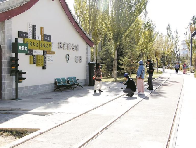 國慶節(jié)當(dāng)天的格爾木將軍樓公園,處處涌動著喜慶的熱浪。鮮紅的五星紅旗在園區(qū)上空迎風(fēng)招展,紅綢燈籠掛滿枝頭,“國慶快樂”的彩色標(biāo)語隨處可見,游客或拍照,或帶著孩子追逐嬉戲,清脆的笑聲與志愿者講解青藏公路歷史的聲音交織在一起。