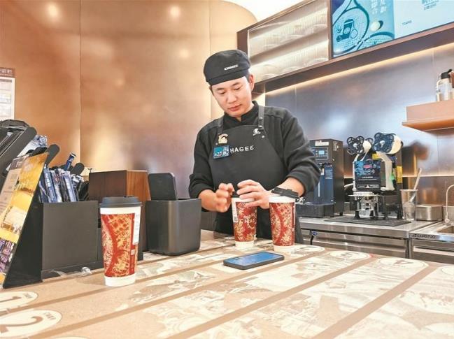 只見沙海邦熟練地將剛剛制作完成的茶飲擺在取餐口。作為一名制茶師,這個年輕人不僅制作速度快,而且水準很高,一點不輸其他員工。
