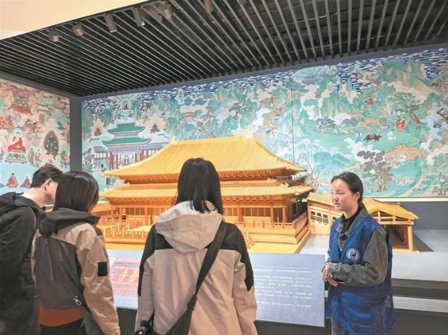 為了更好地完成自己的目標(biāo),在拿到講解詞后,范芠鑫迫不及待地練習(xí)起來。擔(dān)任暑期講解員后,她又針對游客感興趣的內(nèi)容不斷豐富自己的解說。比如在講到舞蹈紋彩陶盆時,她會補充介紹這件文物的原件藏于國家博物館;在介紹永樂款銅鎏金觀音立像時,她會指著展廳一旁瞿曇寺隆國殿等比例微縮的木質(zhì)模型介紹瞿曇寺……