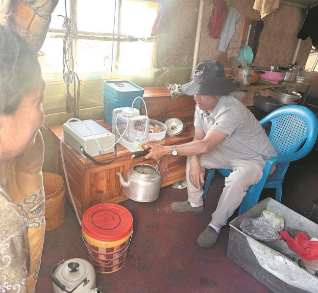 縣疾控中心工作人員為牧民示范凈水器用法。馬振東 攝