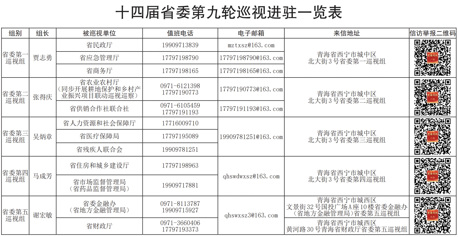 青海新聞網(wǎng)·江源新聞客戶端訊 根據(jù)省委統(tǒng)一部署,10月28日至31日,省委5個巡視組先后完成對省委金融辦(省地方金融管理局)和省民政廳、省應急管理廳、省商務廳、省農(nóng)業(yè)農(nóng)村廳、省人力資源和社會保障廳、省住房和城鄉(xiāng)建設廳、省財政廳、省市場監(jiān)督管理局(省藥品監(jiān)督管理局)、省醫(yī)療保障局、省殘疾人聯(lián)合會、省供銷合作社聯(lián)合社等11家黨組(黨委)的巡視進駐并開展工作,在巡視省農(nóng)業(yè)農(nóng)村廳時同步開展耕地保護和鄉(xiāng)村產(chǎn)業(yè)振興項目聯(lián)動巡視巡察。