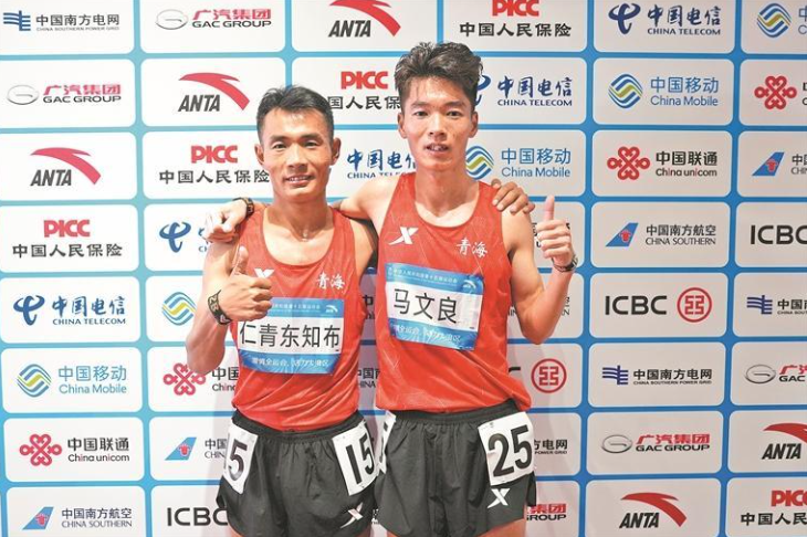 在混采區(qū),馬文良看著隊友仁青東知布激動地說:“我?guī)熜质巧蠈萌\會的馬拉松冠軍,我要向他看齊。今天,我特別感謝他,是他‘犧牲’了自己為我爭取了更多發(fā)揮的空間,這塊獎牌的光芒是屬于我們這個團隊的。”聽馬文良這么一說,本就比較靦腆的仁青東知布有點不好意思:“他真的很優(yōu)秀,下一個四年,我們還要一起努力,一起加油。”采訪結(jié)束時,他們自豪地說:“我們的家鄉(xiāng)是青海省海北藏族自治州,我們都是蘇偉教練的學(xué)生。”