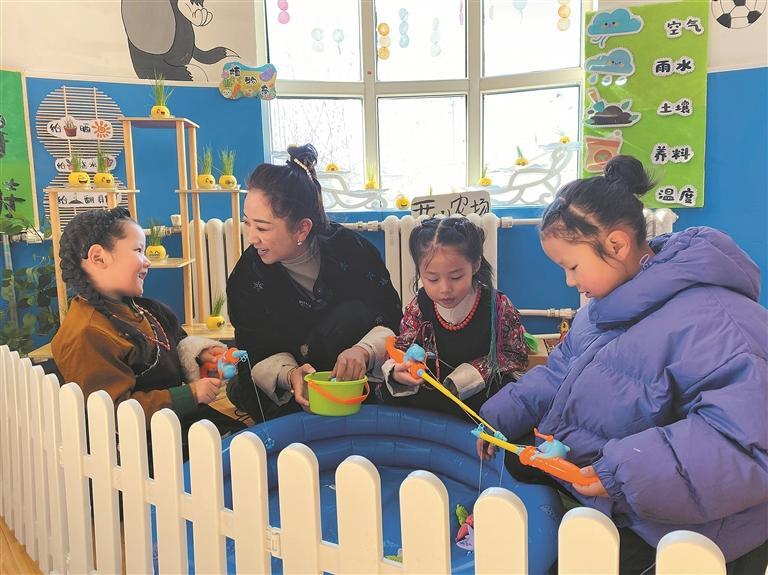 園長(zhǎng)楊毛措(左二)正和孩子們玩釣魚(yú)。本報(bào)記者 欒雨嘉 羋嶠 攝