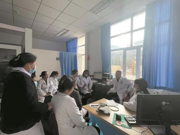 在囊謙縣人民醫(yī)院的遠(yuǎn)程會診中心內(nèi),梁海峰正帶著院里的骨干醫(yī)生與首都醫(yī)科大學(xué)附屬復(fù)興醫(yī)院進行一場跨越千里的“云端”培訓(xùn)。培訓(xùn)結(jié)束后,顧不上休息,梁海峰又快步來到內(nèi)科診室,此時門外已有很多等候的患者。