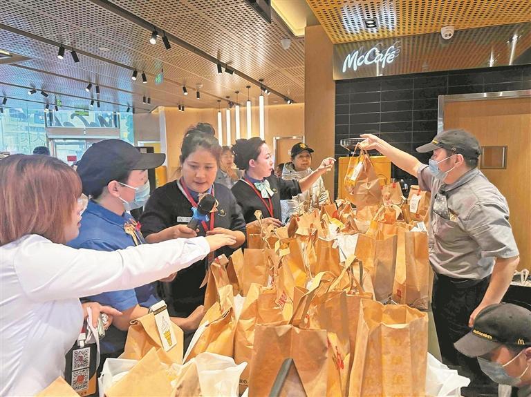 麥當勞店內工作人員正緊張有序地打包餐品,堆滿桌面的紙袋彰顯出開業(yè)首日的火爆消費需求。