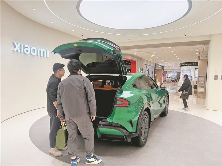 小米門店內,消費者圍繞展車向工作人員咨詢小米汽車相關信息。