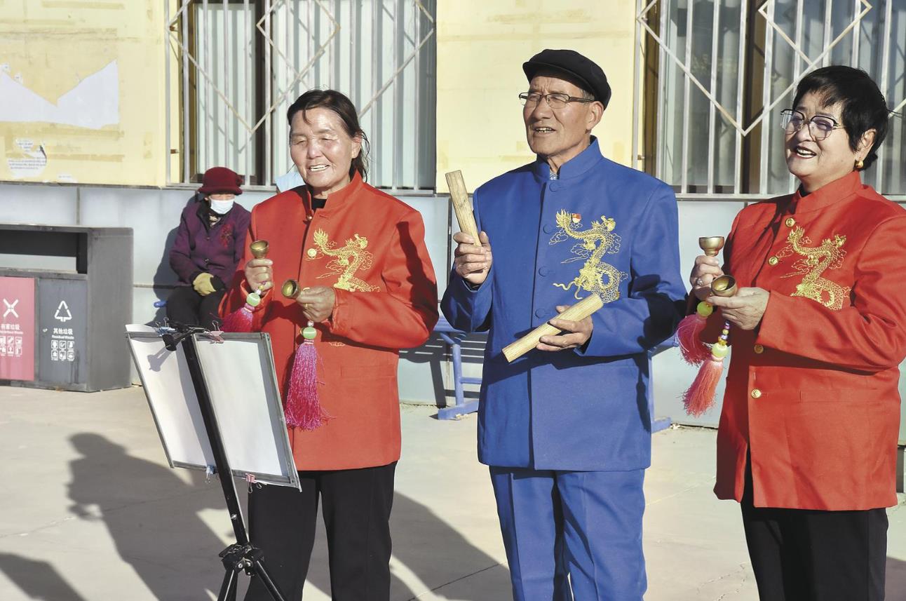 12月17日上午,記者來到位于國道109旁的上灘東村,看到幾位老人圍坐在一起,有人拉著板胡,有人彈著三弦,正聲情并茂地唱著。領(lǐng)唱的老人叫山永寶,今年71歲,是隊里的臺柱子,也是一名老黨員。