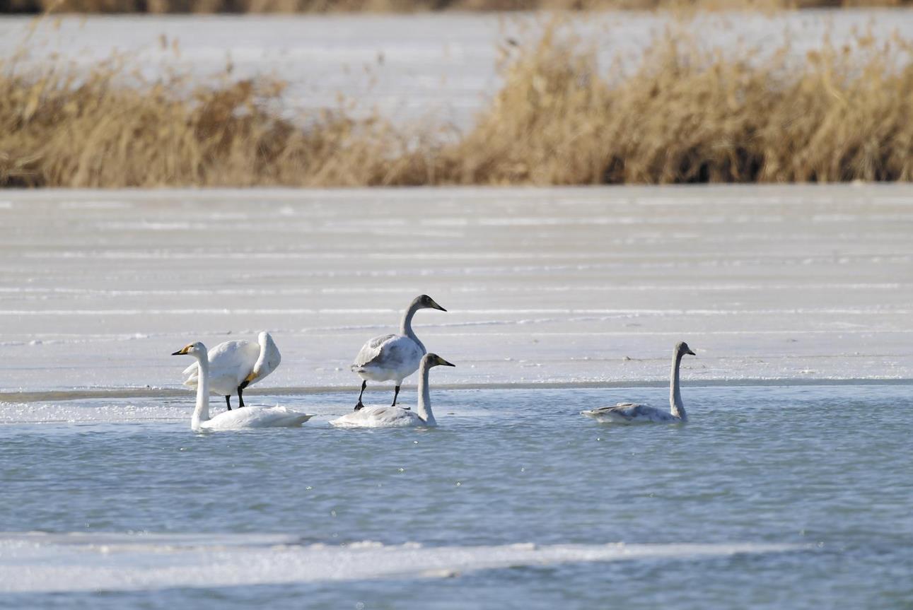 往前走了好一段路,終于看到一群大天鵝的身影。這幾天跑監(jiān)測(cè)點(diǎn),幾乎每個(gè)地方都能見到大天鵝,它們有的羽毛雪白,有的卻是灰色的。向水鳥監(jiān)測(cè)員詢問才得知,灰色羽毛的是亞成體,等長(zhǎng)到成年,羽毛就會(huì)慢慢變白,而且年齡越大,羽毛越白。這種情況不光大天鵝有,很多鳥都這樣。我之前見過灰色的黑頸鶴,還納悶怎么不是黑色的,原來那也是亞成體,漲知識(shí)了。