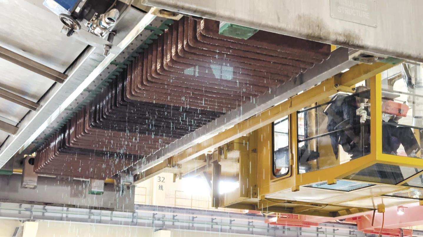 青海銅業(yè)電解車間用天車吊起陰極銅。張鵬 攝