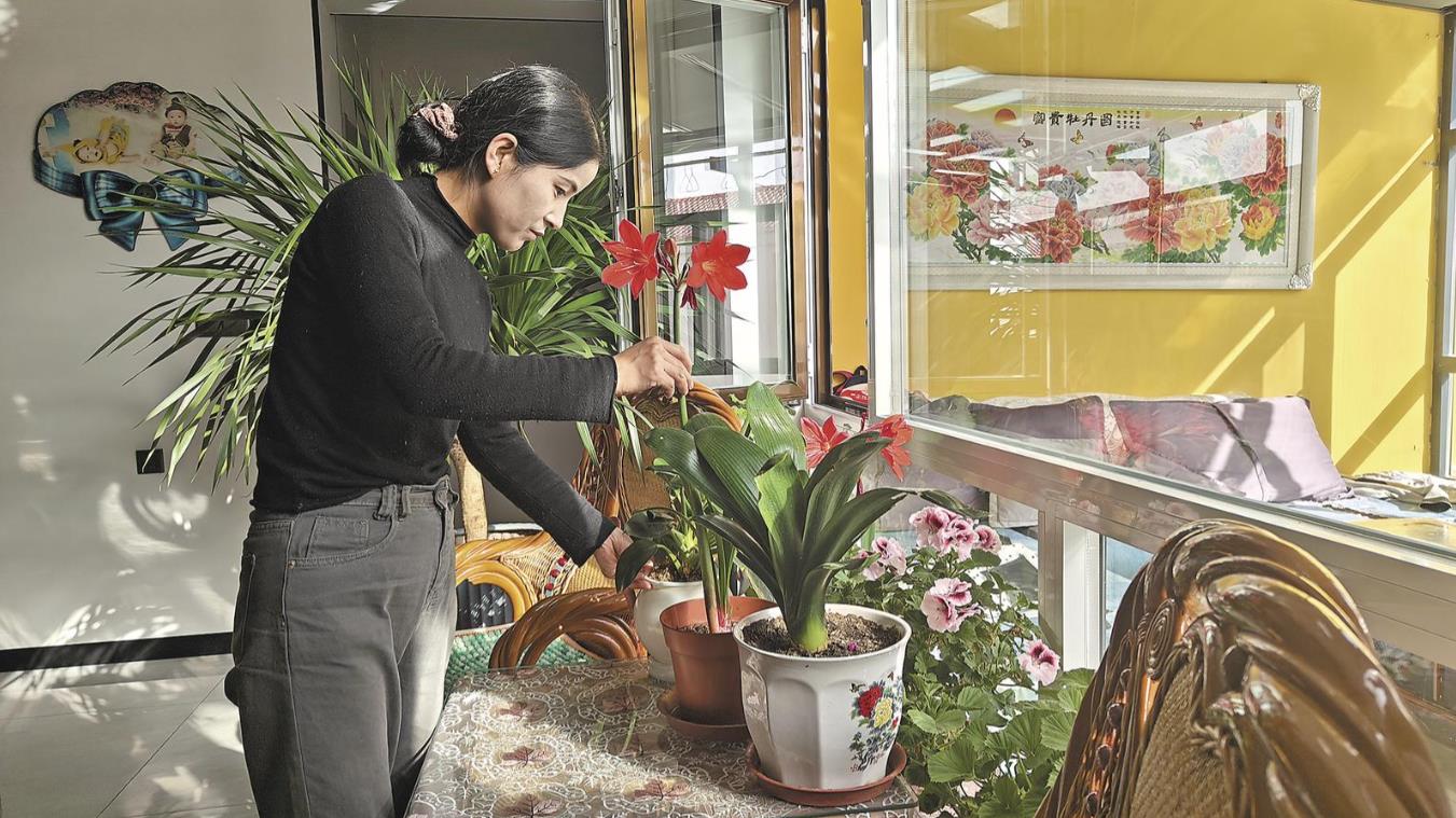 趙國梅正在欣賞家里的花。楊紅霞 攝