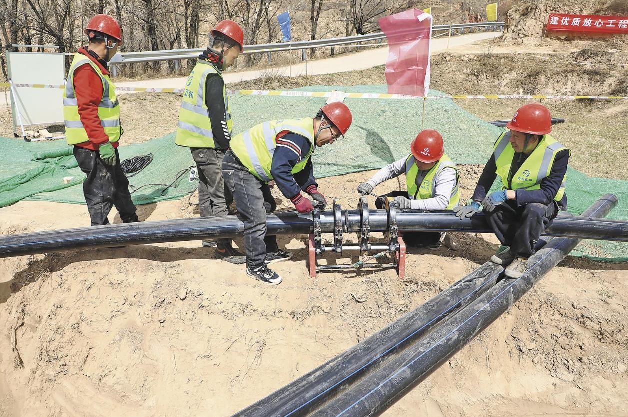 “往左一點,好,落!”指揮員大聲喊著口令……只見一根根數(shù)米長的供水管被吊車精準吊入溝槽,工人們緊隨其后,熱熔焊接精準快速,一根根嶄新的供水管不斷延伸,沿著蜿蜒的溝槽向遠處鋪展。