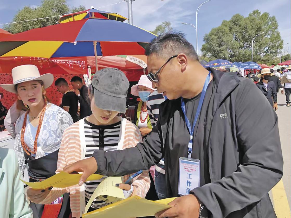 加洛才讓(右一)在招聘會上發(fā)放崗位信息表。本人供圖