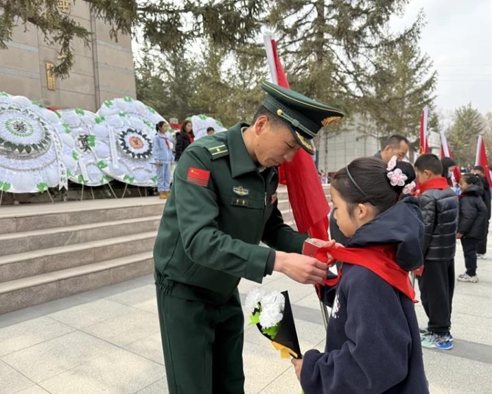 當天的西寧市烈士陵園內,松柏蒼翠挺拔,氛圍莊嚴肅穆,“革命烈士永垂不朽”紀念碑巍然矗立。紀念碑前,各中小學師生整齊列隊、神情肅穆,依次開展瞻仰英雄紀念碑、向革命烈士默哀、敬獻花圈等儀式,以莊重禮儀緬懷先烈功績;顒蝇F(xiàn)場,一場莊嚴的少先隊員入隊儀式同步舉行。南大街小學50名新隊員在鮮艷的中國少年先鋒隊隊旗下,佩戴紅領巾,莊嚴宣誓入隊,紅色信仰在新隊員心中深深扎根。儀式結束后,學生們沿著臺階緩步前行,來到烈士墓前,輕輕擦拭墓碑,小心翼翼獻上親手制作的小白花,用質樸純真的行動,表達對革命先烈的深切緬懷與崇高敬意。“站在革命烈士紀念碑前,望著飄揚的隊旗,我內心滿是崇敬。先烈們用鮮血和生命換來了我們如今的和平生活,紅領巾是紅旗的一角,更承載著我們少年一代的責任。我們要把對先烈的緬懷化作學習動力,努力學習、錘煉本領,長大后傳承先輩精神,勇?lián)鷷r代使命,讓紅色基因代代相傳。”南大街小學五年級學生吳思睿眼神堅定地說。