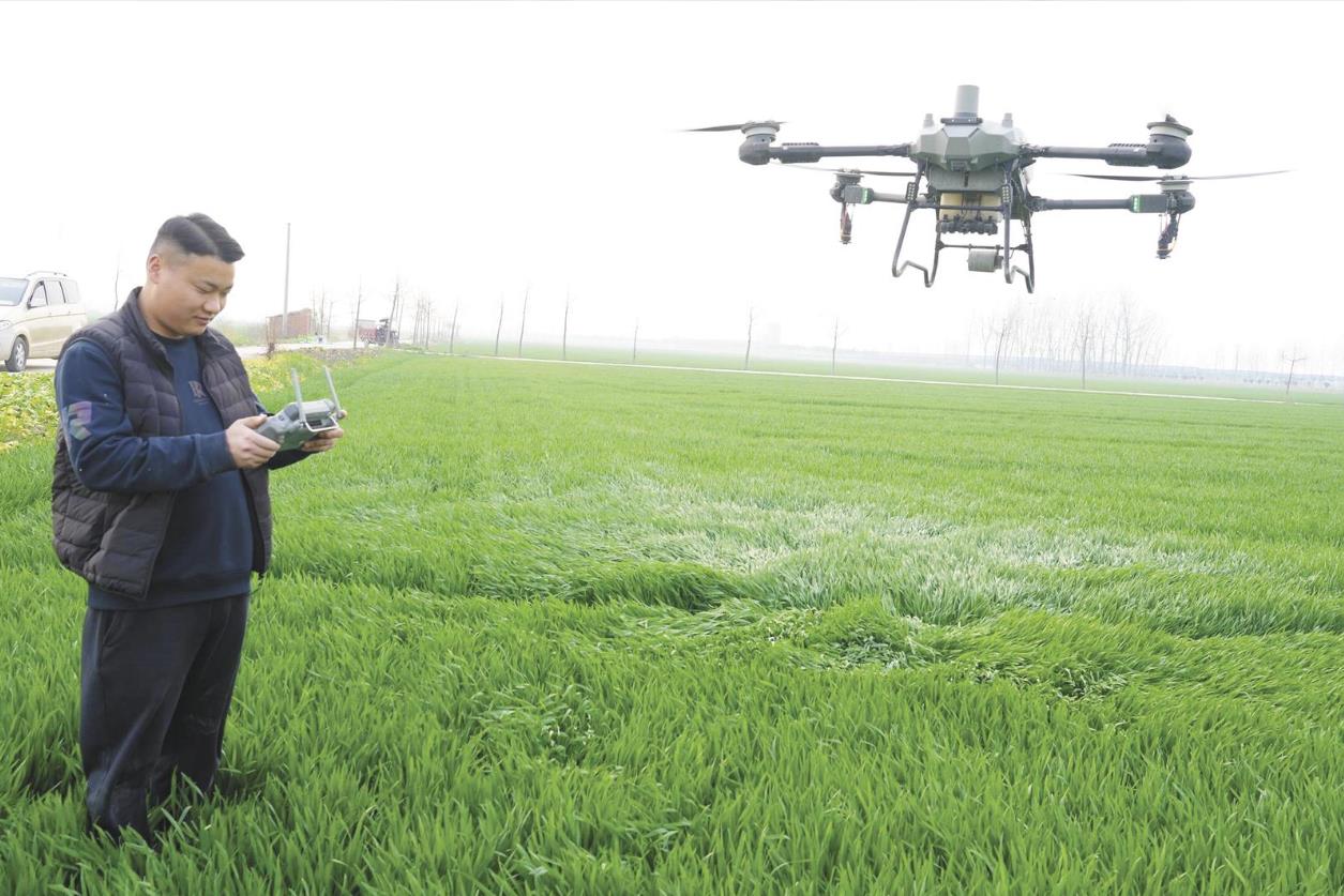 淮濱縣大疆農(nóng)業(yè)公司無人機(jī)飛手柴坤濤操作無人機(jī),在固城鄉(xiāng)的麥田里給小麥噴灑葉面肥。河南日報(bào)記者 王長江 攝