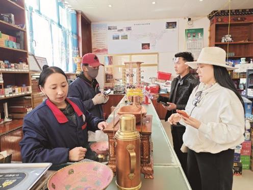 甘達(dá)村利眾專業(yè)合作社成立于2010年。2013年,村里用集體積累的第一桶金搭配政府扶持資金,將閑置羊圈改建成幾十平方米的小賣部。2015年,小賣部擴(kuò)建升級(jí)為綜合超市。2018年起,合作社開始從尼泊爾批量進(jìn)口銅器,吸引了周邊縣鄉(xiāng)群眾前來選購(gòu)。